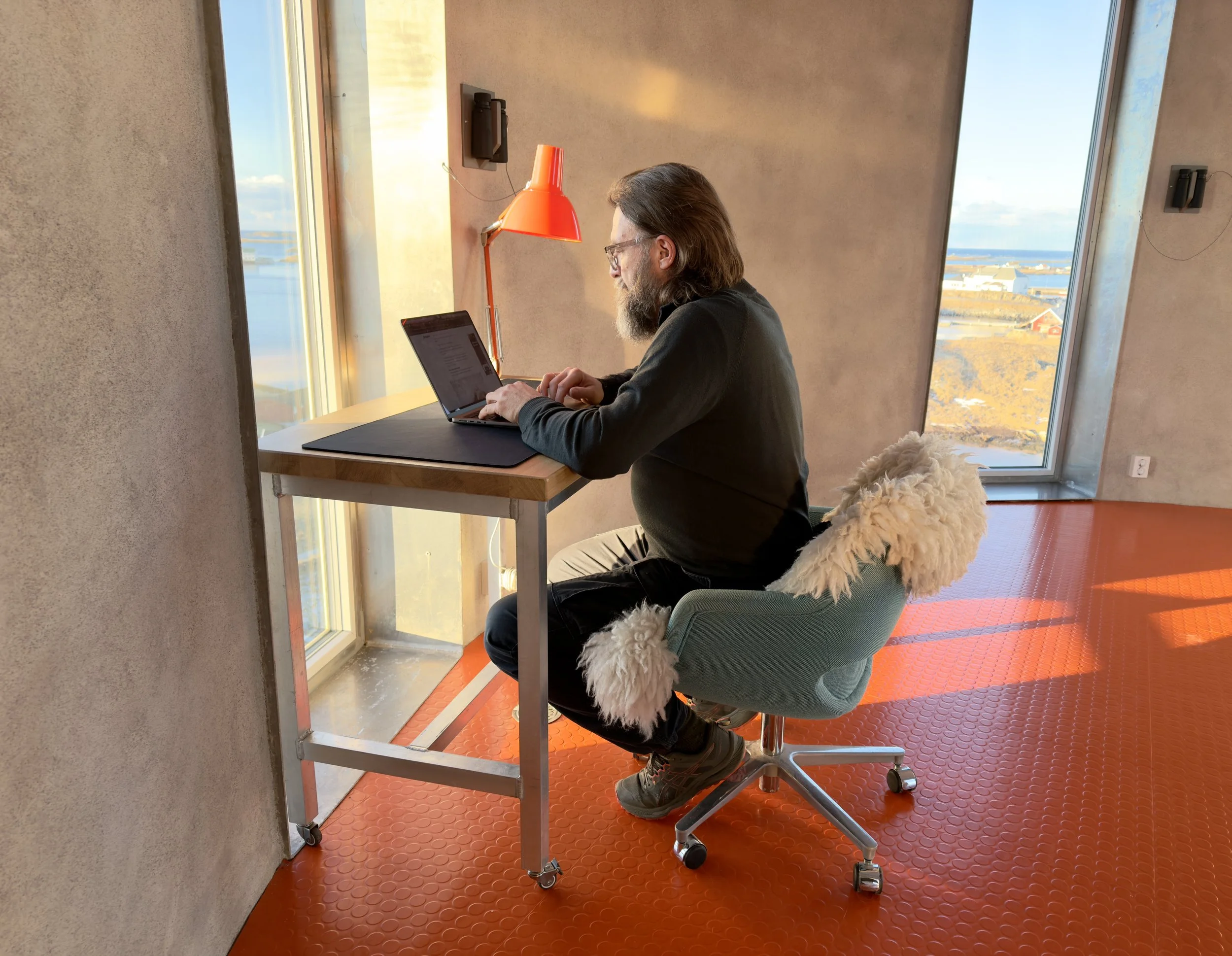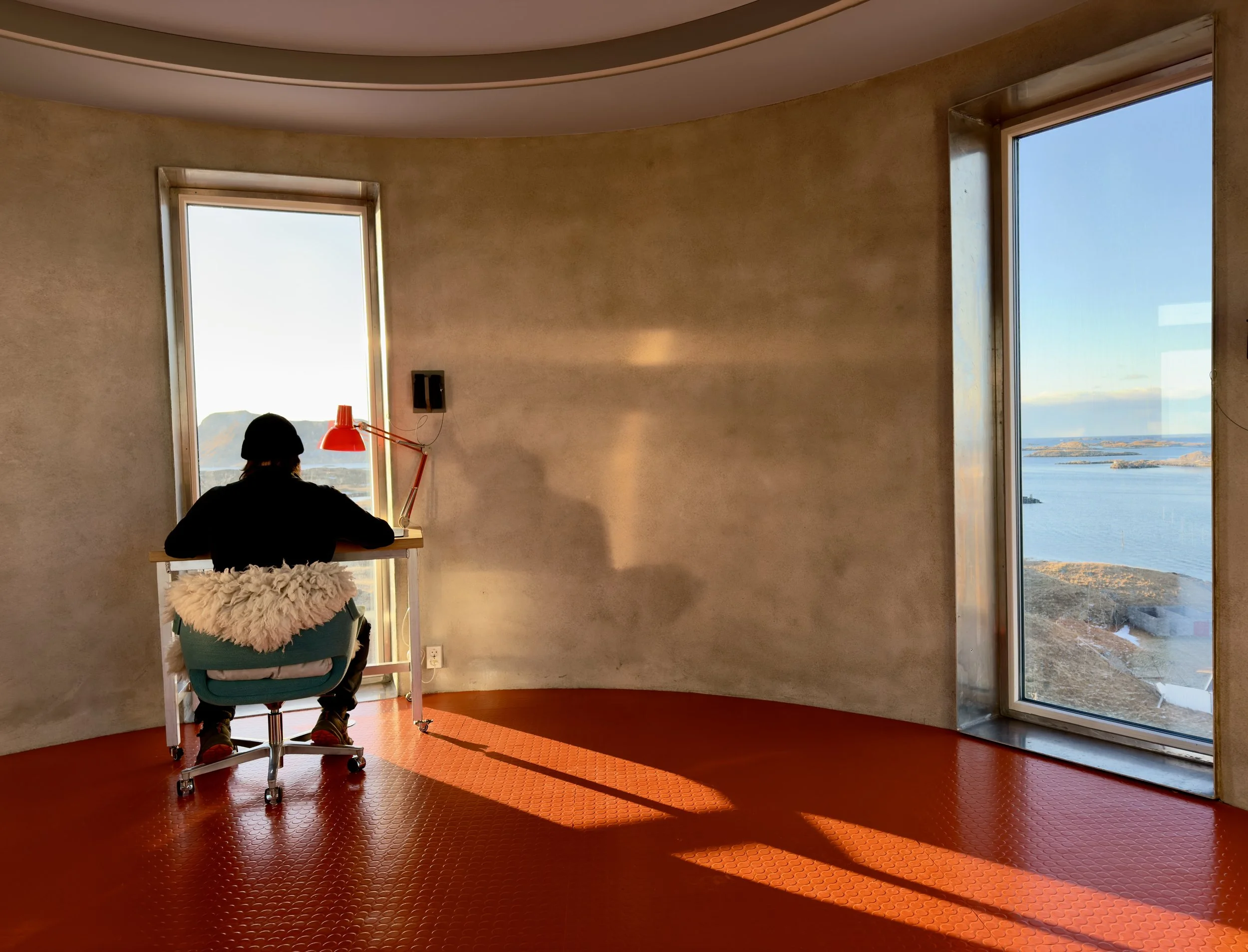 I tårnet finnes ett skrivebord på hjul. Det kan flyttes mellom de fire vinduene og glassdøren. Du har dermed fem ulike utsikter å velge mellom og kan variere arbeidsplassen gjennom dagen.
